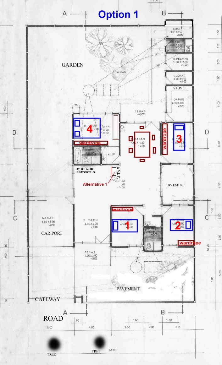 blueprint-wasis1.jpg - Option 1 with bedroom/wardrope layouts under S/no. 1, 2, 3, 4.